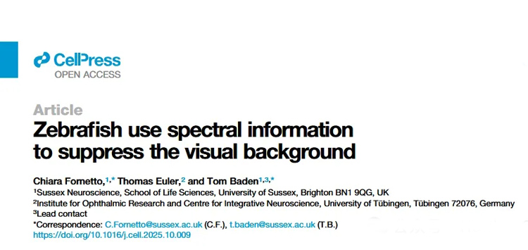 本研究探讨了斑马鱼如何利用水下环境中光谱信息随距离衰减的物理特性,通过视网膜中不同类型的视锥细胞之间的拮抗作用,实现对视觉背景的抑制,从而更有效地感知前景物体。通过结合遗传学、电生理学、计算建模和虚拟现实行为实验,首次完整揭示了这种基于颜色的背景抑制如何帮助动物在复杂视觉环境中更清晰地“看见”目标,重塑了对视觉系统古老的水生起源的理解,并推测哺乳动物视锥细胞的丢失是其陆地化适应的结果,而非夜行性生活所致。