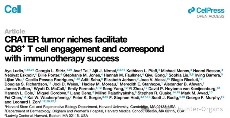 本研究利用斑马鱼,在肿瘤微环境中发现并命名了一种名为 “CRATER” (凹陷状生态位)的关键结构。该结构是肿瘤内部一个 “免疫友好型”的特殊区域,其中富含活跃增殖的CD8⁺ T细胞和特定的抗原呈递细胞,形成了一个促进免疫细胞识别和攻击癌细胞的局部环境。研究表明,CRATER结构的存在与患者对免疫检查点抑制剂治疗的积极反应和更长的生存期显著正相关。通过观察斑马鱼体内的黑色素瘤,发现CD8⁺ T细胞并非在肿瘤表明漫无目的地巡逻,而是在黑色素瘤边缘的凹陷区域聚集,与黑色素瘤细胞形成长时间的相互作用。通过斑马鱼进一步验证,揭示了调控CRATER形成的代谢机制,并提出靶向增强CRATER可作为改善癌症免疫治疗的新策略。